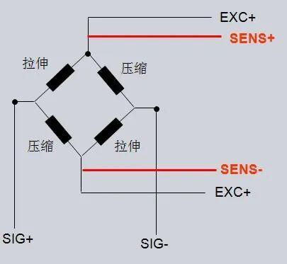 對(duì)于四線制傳感器,只有下圖黑色所示的四個(gè)電纜,其中EXC+和EXC-是稱重模塊給傳感器的激勵(lì),SIG+和SIG-為稱重傳感器的輸出;對(duì)于六線制傳感器,會(huì)多出兩根紅色的線,SENSE+和SENSE-它們的作用是什么呢?這兩根線是做補(bǔ)償用的,當(dāng)傳感器和稱重模塊的距離較遠(yuǎn)時(shí),這兩根線會(huì)進(jìn)行補(bǔ)償,進(jìn)而使得測量結(jié)果更精確一些。