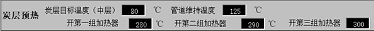催化后溫度到達(dá)CO預(yù)熱設(shè)定的目標(biāo)溫度后,進(jìn)入炭層預(yù)熱階段,此階段脫附風(fēng)機(jī)仍然保持運(yùn)行,可以給風(fēng)機(jī)設(shè)定一個(gè)固定頻率,打開(kāi)管道閥1,打開(kāi)管道閥2,打開(kāi)炭箱的2個(gè)脫附閥,設(shè)定管道溫度(檢測(cè)溫度為混風(fēng)箱后熱電偶溫度值),設(shè)定碳箱上層溫度(檢測(cè)溫度為碳箱上層熱電偶溫度值)。補(bǔ)冷閥根據(jù)管道溫度進(jìn)行比例調(diào)節(jié),補(bǔ)冷風(fēng)機(jī)根據(jù)需要自動(dòng)開(kāi)啟(補(bǔ)風(fēng)閥開(kāi)度≥2%時(shí)),同時(shí)打開(kāi)排放閥2。三組加熱器分別設(shè)定不同的溫度值,當(dāng)催化后溫度低于設(shè)定值時(shí),加熱器開(kāi)啟。注:碳層預(yù)熱階段不可以打開(kāi)排放閥1(排放閥1連接排放煙筒,有可能打開(kāi)后造成濃度超標(biāo)),如果碳箱或管道溫度高于設(shè)定溫度后這時(shí)需要從排放閥2排出。此階段需要設(shè)置的參數(shù)如圖4所示。