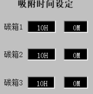對(duì)尾氣做預(yù)處理,對(duì)于含水量較大尾氣需要在尾氣進(jìn)入過(guò)濾裝置前用水汽分離裝置進(jìn)行除水處理,否則會(huì)大大降低發(fā)熱管的使用壽命。含酸尾氣也要進(jìn)行除酸處理,因?yàn)樗釙?huì)腐蝕加熱管造成加熱管損壞。本案例共3個(gè)活性炭箱,依據(jù)時(shí)間設(shè)定(圖2)1號(hào)箱吸附時(shí)間到,如果2號(hào)、3號(hào)不在脫附階段就開(kāi)始脫附,1號(hào)箱脫附時(shí),2號(hào)、3號(hào)吸附,1號(hào)箱脫附完成后就進(jìn)行吸附;2號(hào)箱吸附時(shí)間到如果1號(hào)、3號(hào)不在脫附階段就開(kāi)始脫附,2號(hào)箱脫附時(shí),1號(hào)、3號(hào)吸附,2號(hào)箱脫附完成后就進(jìn)行吸附;3號(hào)箱吸附時(shí)間到如果1號(hào)、2號(hào)不在脫附階段就開(kāi)始脫附3號(hào)箱脫附時(shí),1號(hào)、2號(hào)吸附,3號(hào)箱脫附完成后就進(jìn)行吸附,即3個(gè)箱輪流脫附。如果3個(gè)箱時(shí)間設(shè)定相同,首次通電如果3個(gè)箱吸附時(shí)間同時(shí)到達(dá)設(shè)定值,優(yōu)先脫附順序?yàn)?號(hào)、2號(hào)、3號(hào)。
